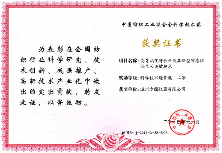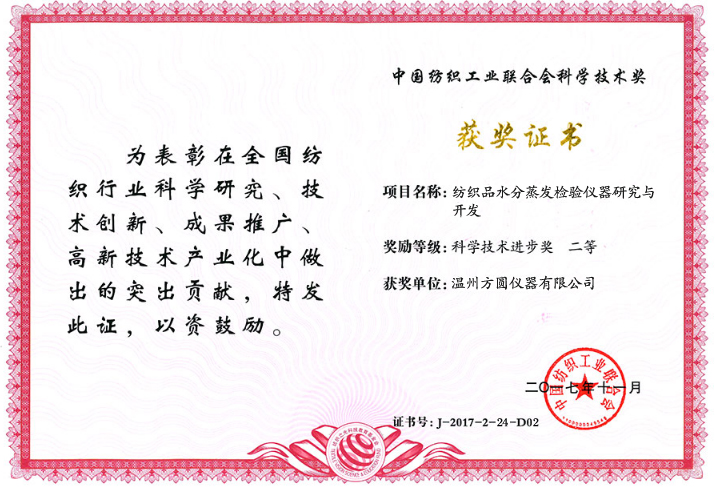 溫州方圓儀器榮獲二項“紡織之光”2017年度科學技術(shù)進步獎二等獎